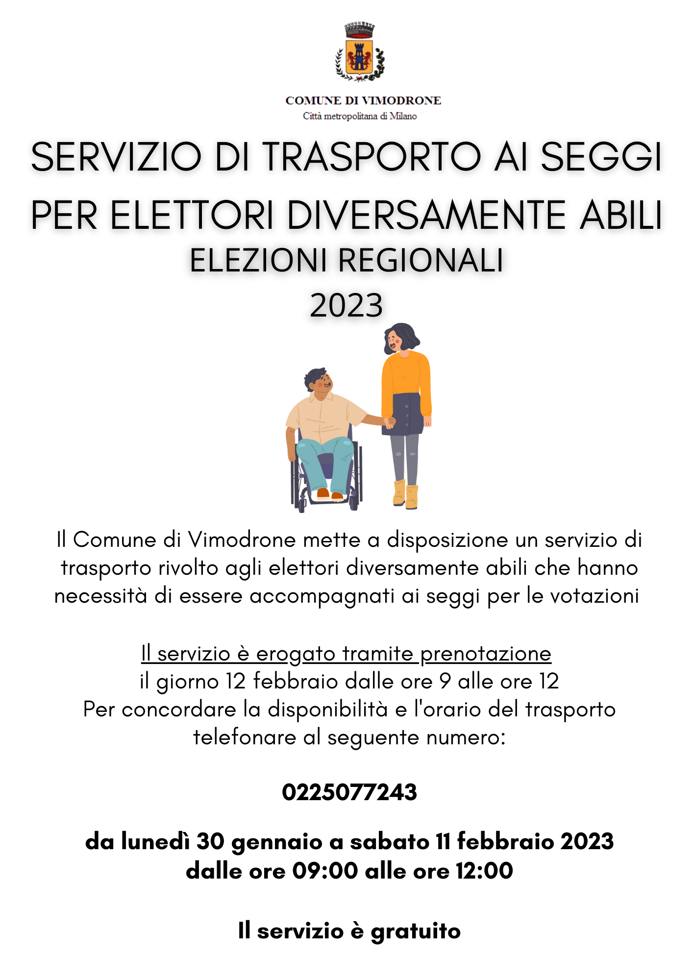 Il giorno 12 febbraio dalle ore 09.00 alle ore 12.00 sarà attivo un servizio di trasporto gratuito per persone diversamente abili che intendono recarsi a votare.