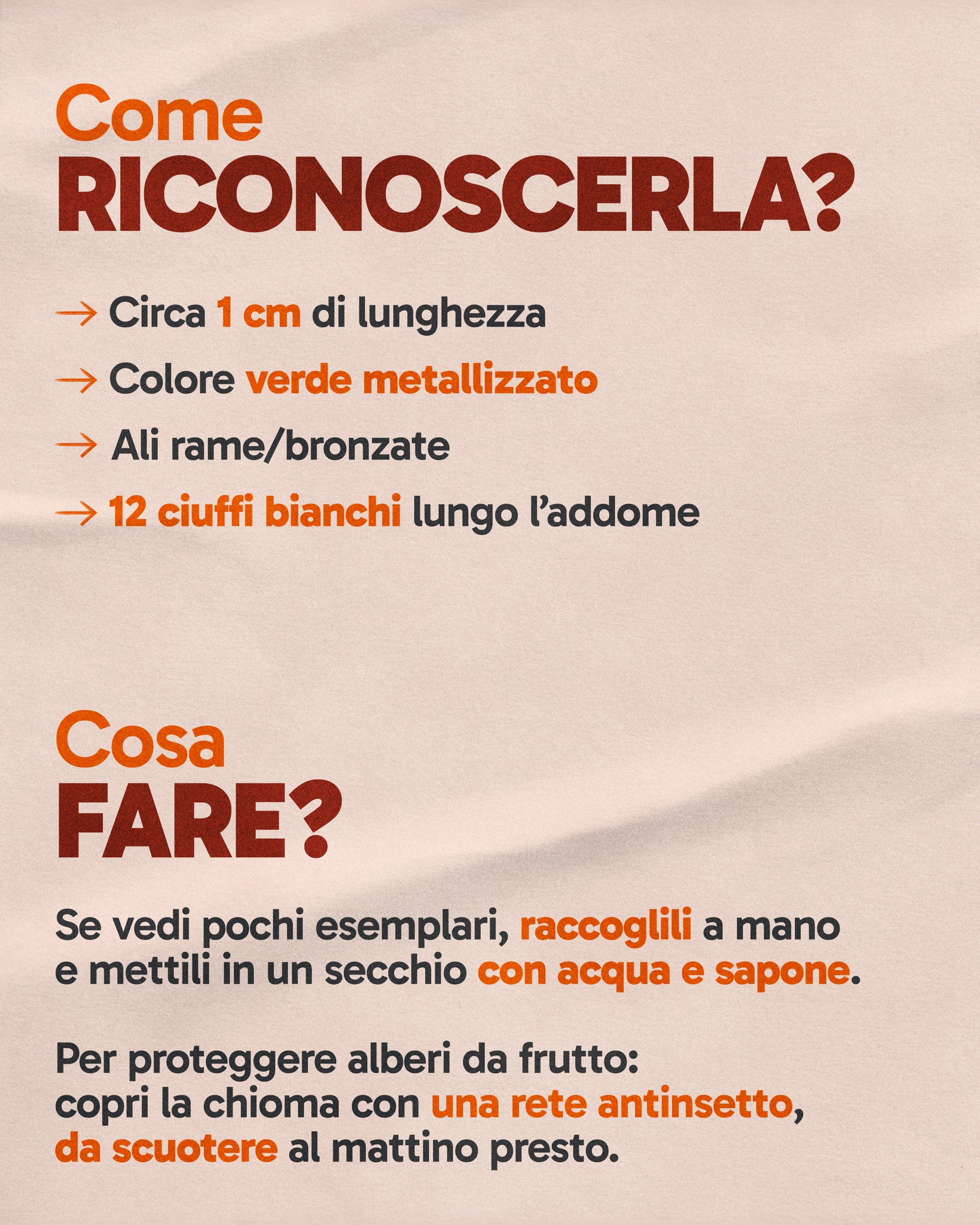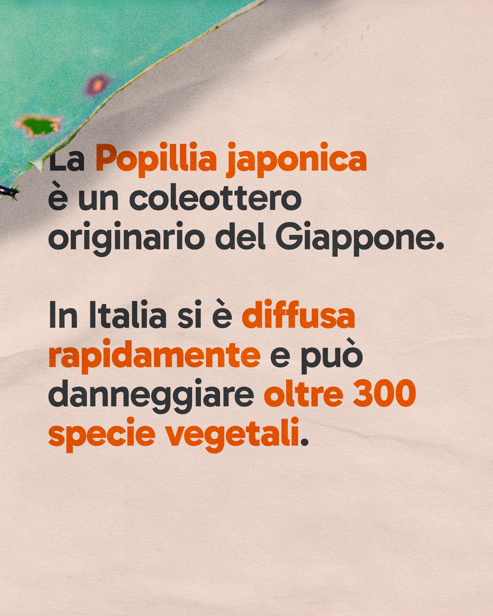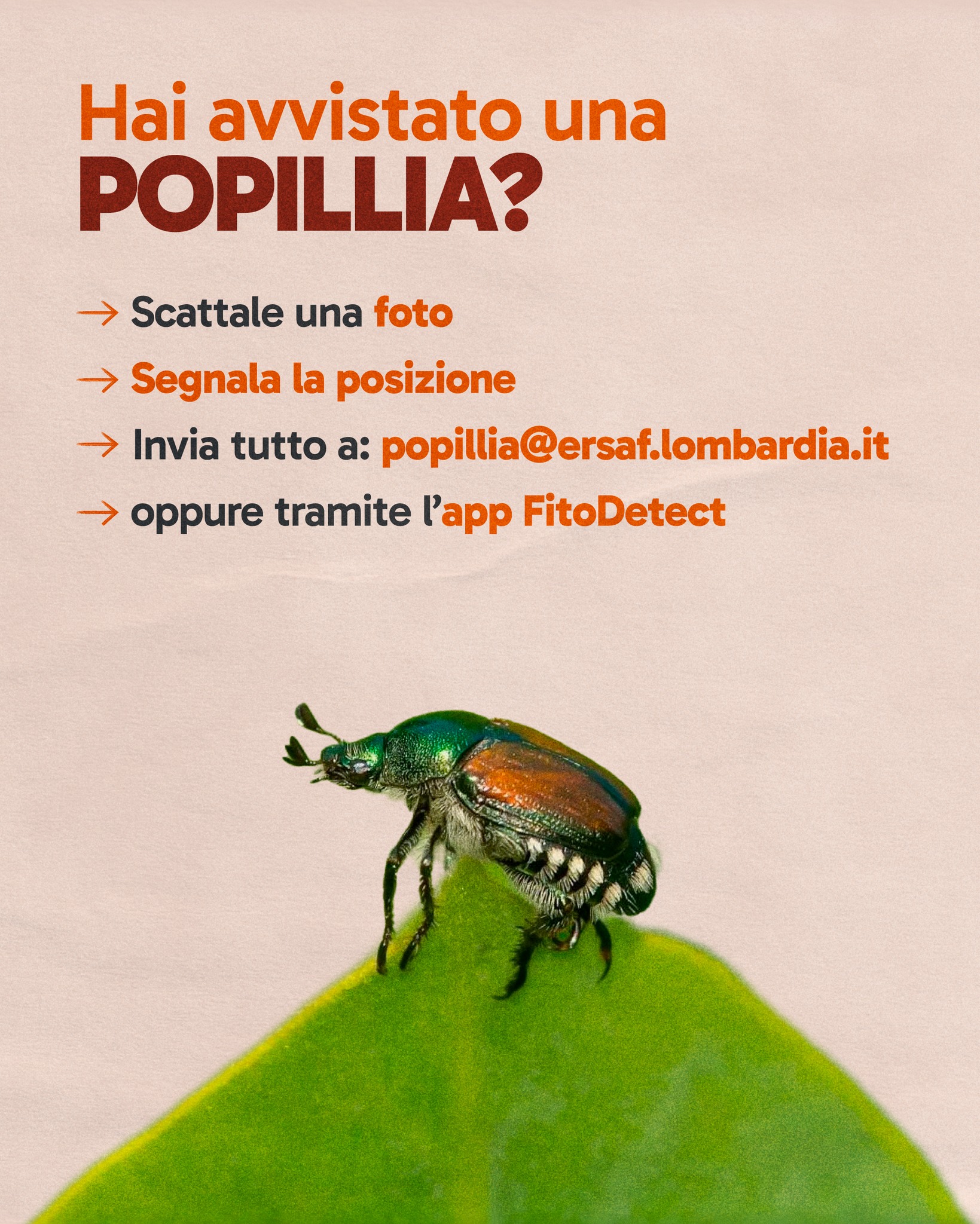 Si chiama Popillia japonica ed è un insetto originario dell’Asia, ormai presente anche sul nostro territorio. Le sue larve si nutrono delle radici di molte piante, mentre gli adulti attaccano foglie, fiori e frutti, causando gravi danni a orti, giardini e colture agricole.