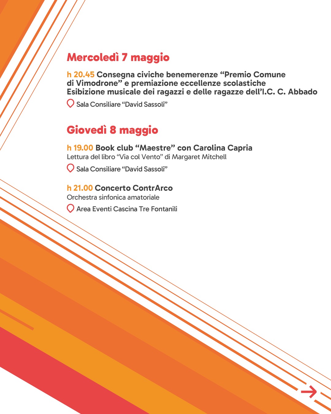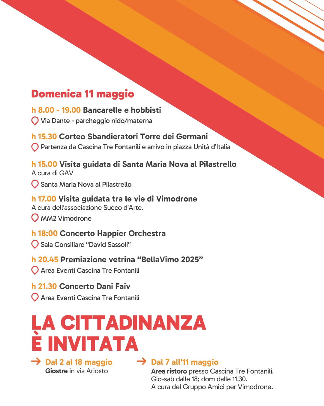 Dal 7 al 11 Maggio la Città di Vimodrone si animerà con tantissimi appuntamenti tra musica, cultura, esibizioni, intrattenimento e numerose iniziative per grandi e bambini, all’insegna dell’aggregazione e del divertimento, ma anche della condivisione dei valori della nostra comunità.
